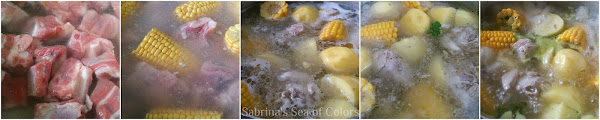 Vamos con las costillas. En una olla amplia colocamos las costillas y las mazorcas cortadas en tres partes. Cubrimos con agua y dejamos hervir durante 10 minutos. Pasado este tiempo agregamos las patatas cortadas en 2 o 3 partes y 3 cucharadas del mojo, y cocemos hasta que las patatas estén hechas. Rectificamos de agua si se nos evapora durante la cocción.