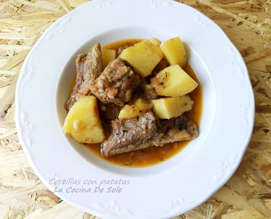 En una olla a presión, echamos un poco de aceite de oliva (no mucho, pues las costillas son muy grasientas) y doramos las costillas, las espolvoreamos antes con romero molido, pebrella y un pelín de sal.