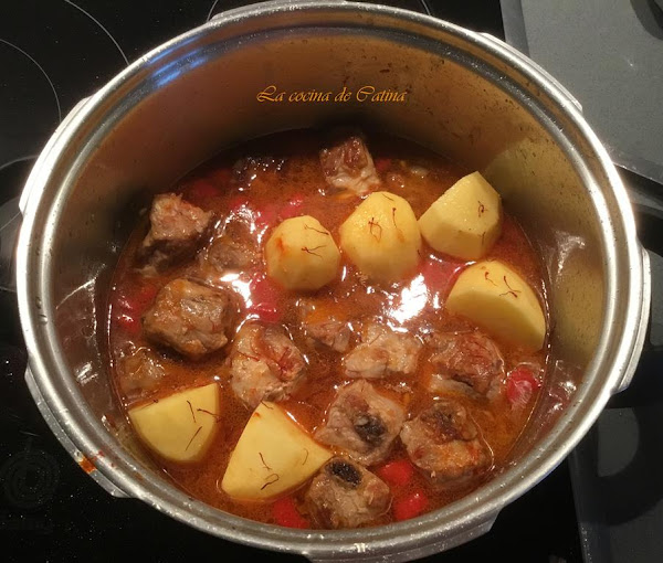 Cortamos las patatas y las añadimos al guiso de costillas. Cerramos la olla y cocinamos durante 8 minutos.