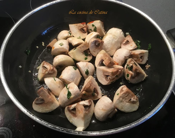 Mientras tanto, salteamos los níscalos, muy limpios y troceados en un poco de aceite, con el diente de ajo restante picado, una pizca de sal y perejil picado.