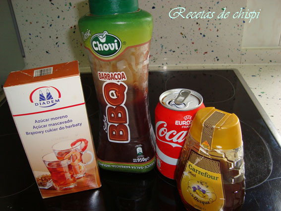 Hacemos una mezcla con la salsa barbacoa, la cantidad que querais, la suficiente para impregnar la costilla una cuantas veces, como decia, la salsa, el azúcar moreno, la miel y el cocacola, mezclar todo muy bien y reservar.