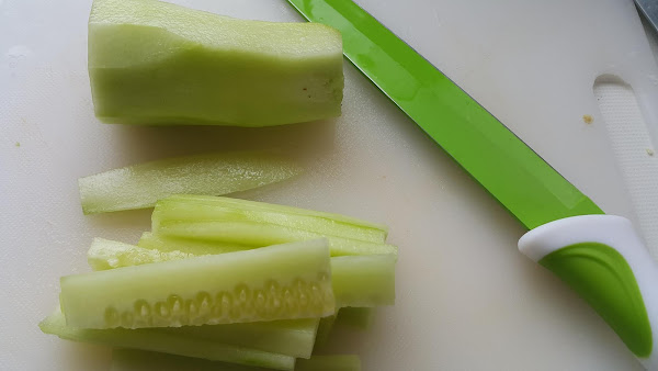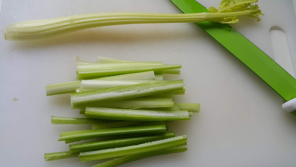 Mientras la carne se cocina empezamos con la verdura. Cortamos el apio en bastoncillos y reservamos.