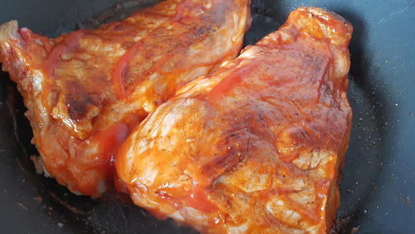 Con la ayuda de un pincel alimentario repartimos la salsa por toda la superficie y repetimos la misma operación por el otro lado. Dejamos la carne a fuego muy bajo y con la tapa puesta.