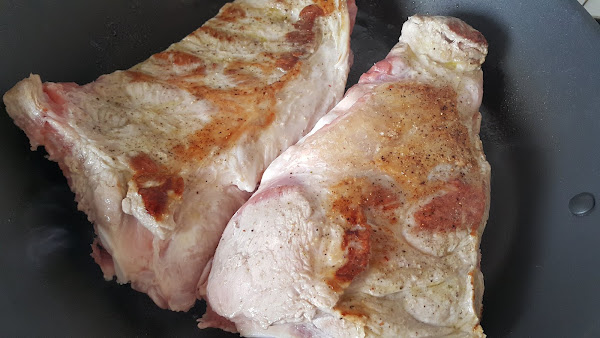 Comenzamos con las costillas. Lo primero que haremos será partir en 2 el costillar para que éste se pueda manejar mejor. Salpimentamos y marcamos a fuego fuerte en una sartén para que se dore por fuera.