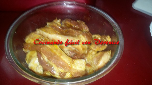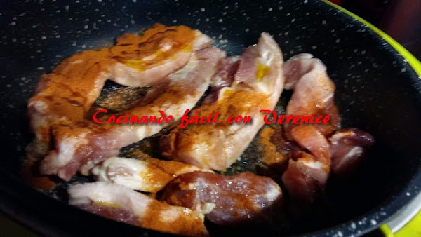 Como las costillas me las dieron ya cortadas solo tuve que adobarlas con la mezcla de pimentón, sal, orégano y AOVE mientras hacía los preparativos para el resto, este adobo tan cortito es inusual para mí pero las prisas me llevaron a ello.
