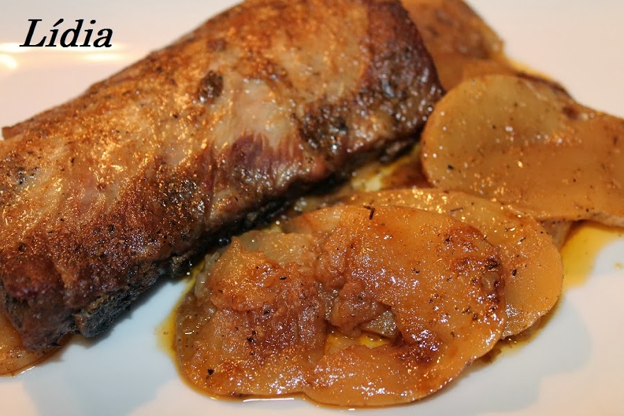 En una fuente de horno colocaremos las patatas, encima las costillas y echaremos por encima la mezcla.