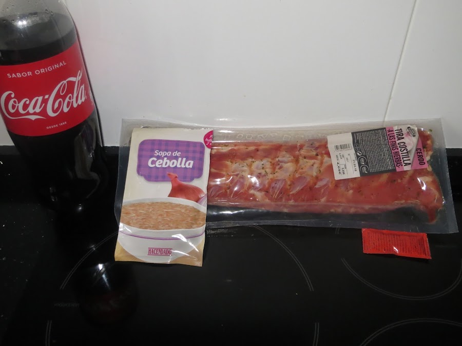 Salpimentamos el costillar y hacemos una salsa con la coca cola, el sobre de sopa de cebolla y el sobre de kétchup.