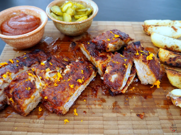 Retirar del horno y cortar las costillas. Antes de servir espolvorear por encima con ralladura de piel de naranja.