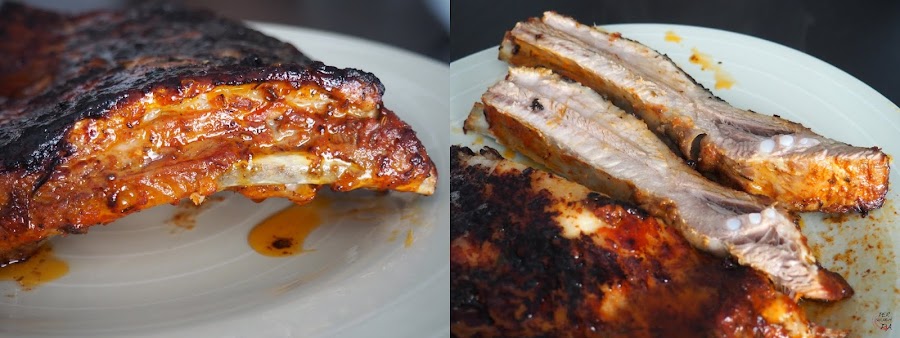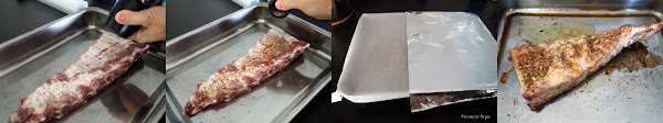 Colocar el costillar en una fuente de horno y espolvorear por ambas caras con pimienta negra molida, pimentón ahumado picante (o dulce, a gustos) y hierbas provenzales (o con la combinación que más os guste). Cubrir la bandeja con papel de horno y sellarla por encima con papel de aluminio.