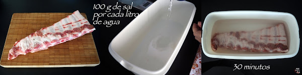 Primero vamos a salar el costillar en un baño de sal. Con esta técnica el alimento incorpora la sal necesaria y de manera homogénea.