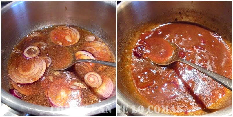 6. Para hacer la salsa ponemos en un cacito el zumo de una naranja, la cebolla o cebolleta cortada en rodajitas finas, la mermelada de ciruelas y el resto del adobo que ha sobrado de las costillas junto con un poco del caldo de hervirlas (aproximadamente le puse un cucharón). Lo dejamos a fuego medio para que reduzca más o menos a la mitad.