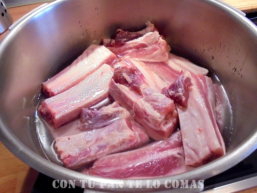 1. En la olla exprés hervimos las costillas con agua y sal. En mi olla se hacen en 15 minutos desde que sale el vapor. Han de quedar totalmente hechas, de manera que la carne se separe del hueso con facilidad.