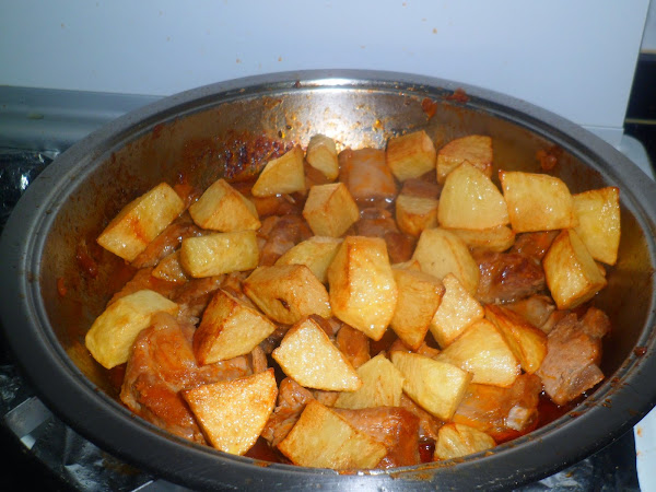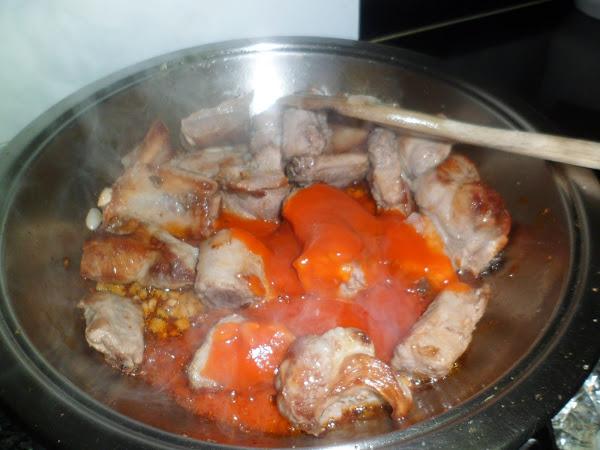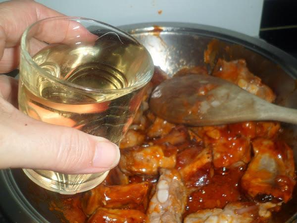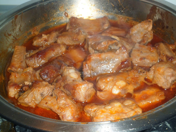 Cuando estén echas las echaremos junto con las costillas y daremos unas vueltas para que cojan el gustito de la salsa y ya estarán listas.