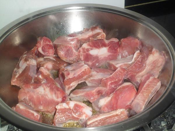 En una sartén pondremos 4 cucharadas de aceite y cuando esté caliente pondremos las costillas a dorar a fuego fuerte.