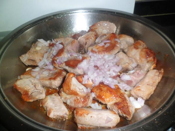 Picaremos la cebolla, cuando las costillas estén doradas echaremos la cebolla.