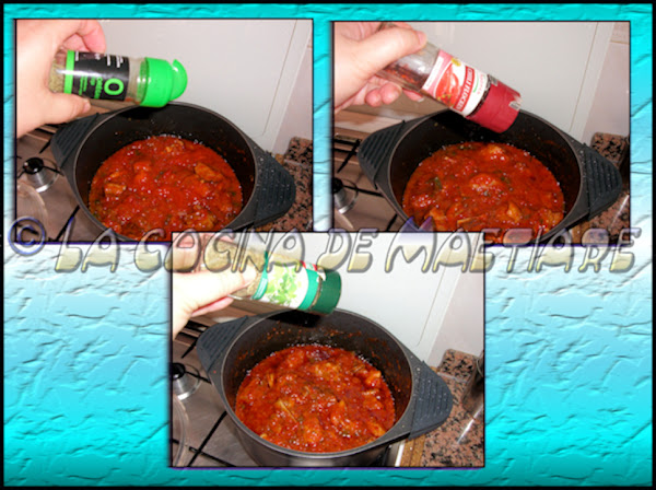 Añadir un poco de orégano, chili de molinillo y hierbas provenzales y cocinar a fuego lento tapado durante unos 10 minutos, removiendo de vez en cuando