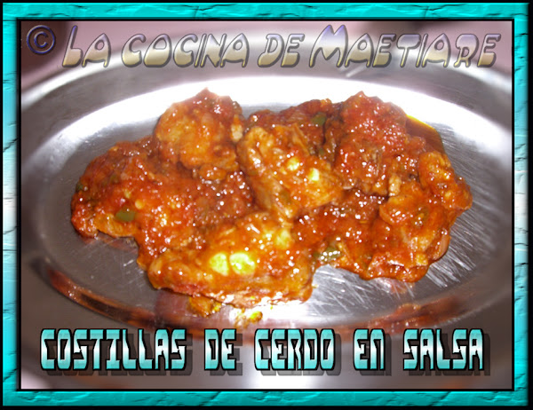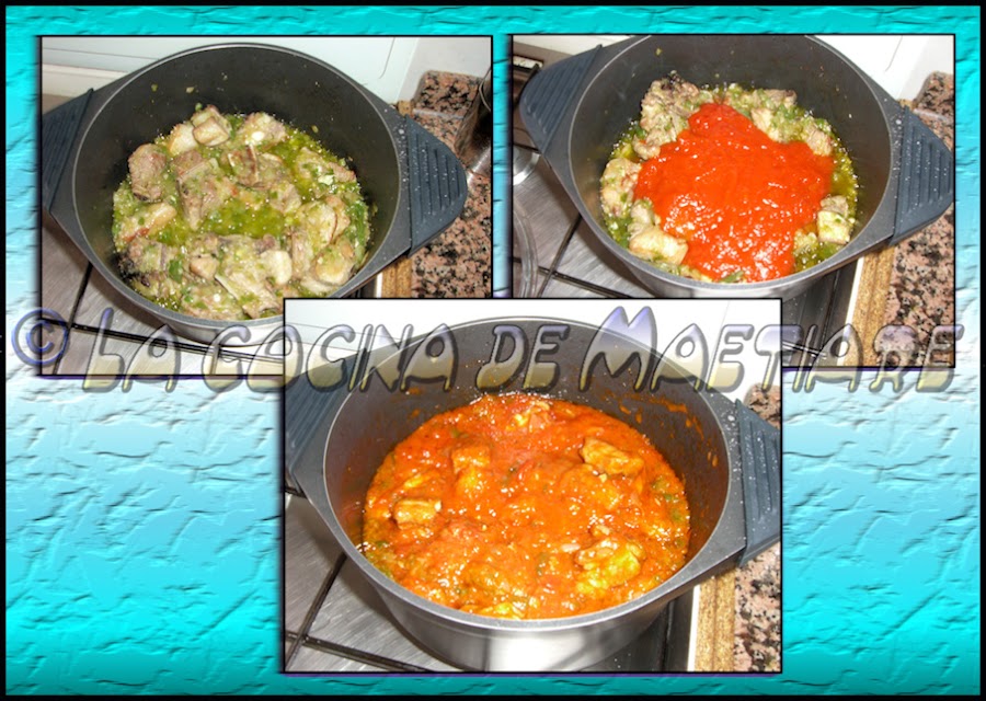 En una cacerola antiadherente, freír las costillas troceadas ligeramente saladas en aceite de oliva virgen, hasta que comiencen a dorar. Añadir cebolla y pimiento picado fino y cocinar el conjunto hasta que la verdura comience a transparentar.Añadir un poco de ajo picadito y mezclar bien .En ese punto añadir el tomate frito, mezclar bien.