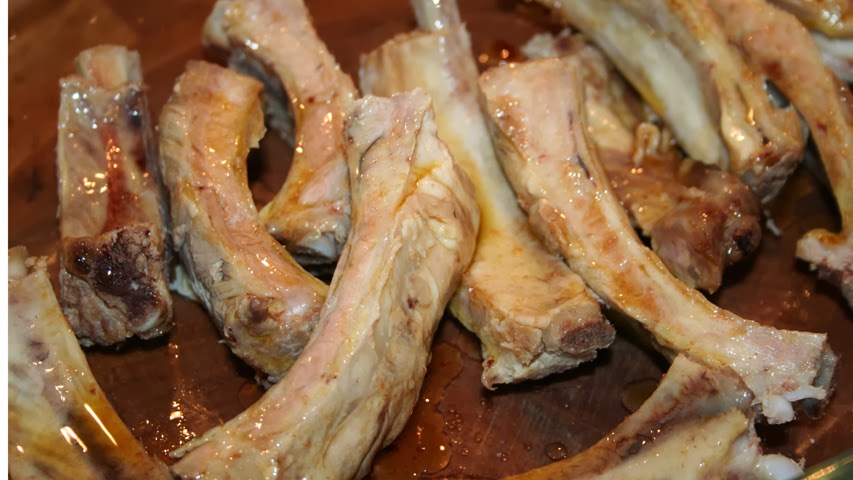 Después de cocer las costillas las dejo enfriar para separarlas, meterlas en la fuente del horno y asarlas con unas pinceladas de una mezcla de soja y aceite de oliva.