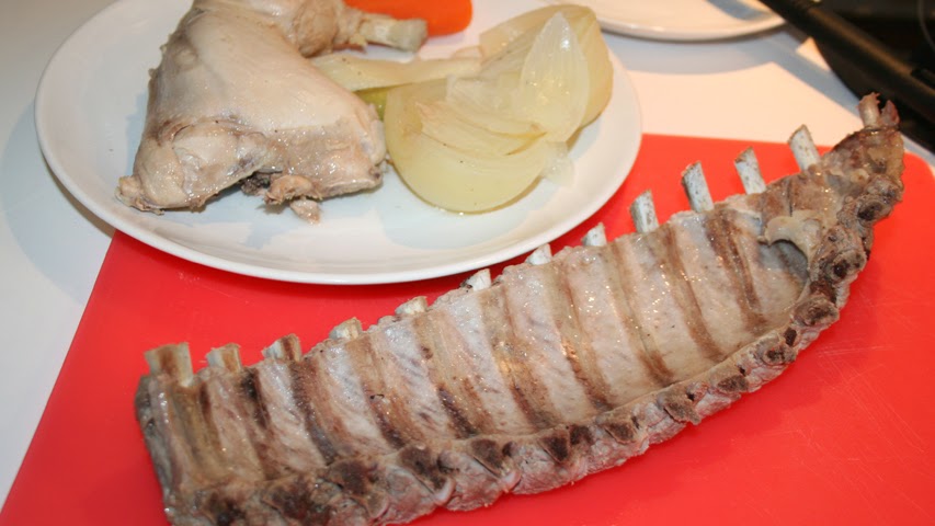 Lo primero que he hecho para que quede bien jugosa la costilla es cocerla junto a algunas verduras y ya he aprovechado y he incorporado un muslo de pollo para que coman las niñas. Total, que al final saco varias recetas: las costillas asadas, el muslito de pollo que desmenuzado es un manjar para las niñas, las verduras que salteadas con una gota de aceite nos encantan a los padres y un montón de caldo de primera calidad para... lo que encarte.