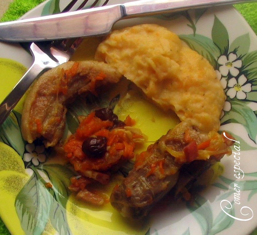 INGREDIENTES: Entre 4-6 costillas por persona (dependerá del tamaño y del hueso), 2 zanahorias hermosas, 1 cebolla, 25 gramos de bacón, 50 gramos de pasas sin semillas, 2 vasos de vino blanco, 1 vaso y 1/2 de agua, una hoja de laurel, orégano, ajo en polvo, sal gruesa, 400 gramos de papas (patatas), 125 gramos de agua, 50 de leche sin lactosa (normal, de cabra, oveja o de soja, según puedan) y aceite.