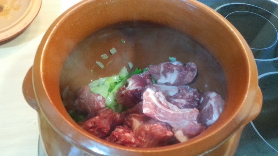 una vez bien sofrito todo echamos las costillas y las salpimentamos