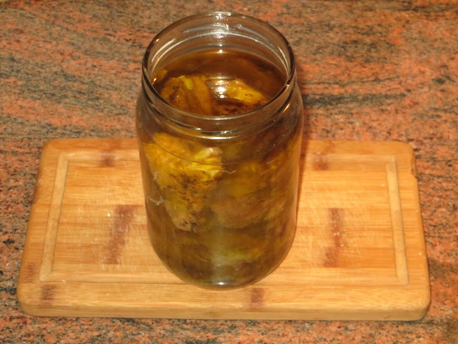 Luego llega la hora de secar la carne, se deja dos días cerca de una lumbre para que se oree bien, en caso de no tener lumbre lo debéis dejar tres o cuatro días. Luego se fríe en abundante aceite, se mete en un tarro y se cubre con aceite y ya está listo para durar varios meses y consumirlo cuando queráis.