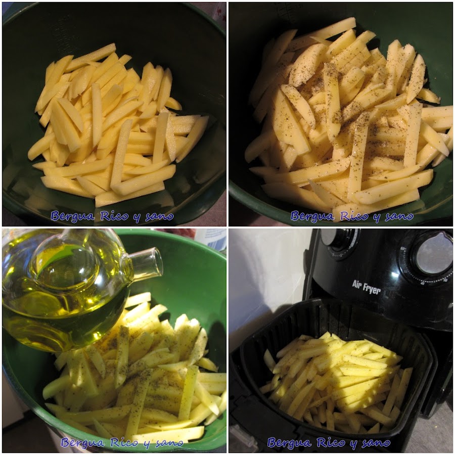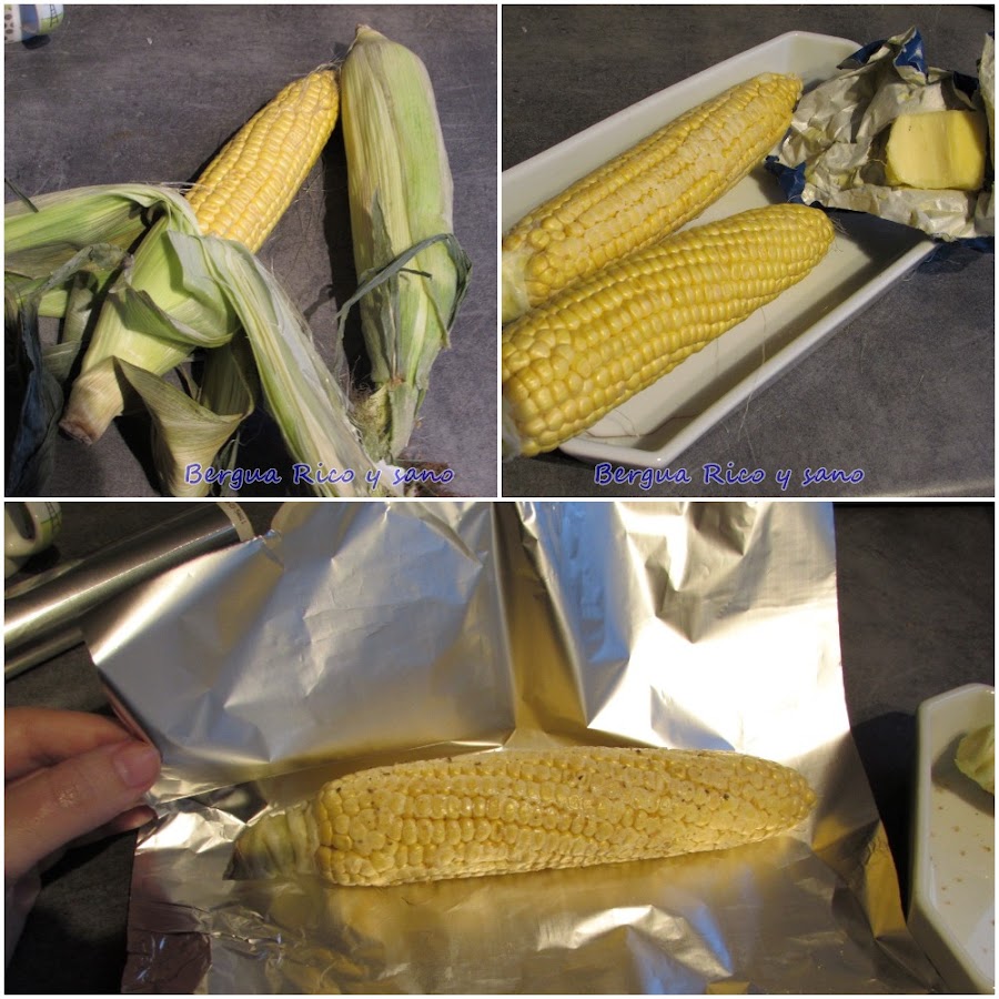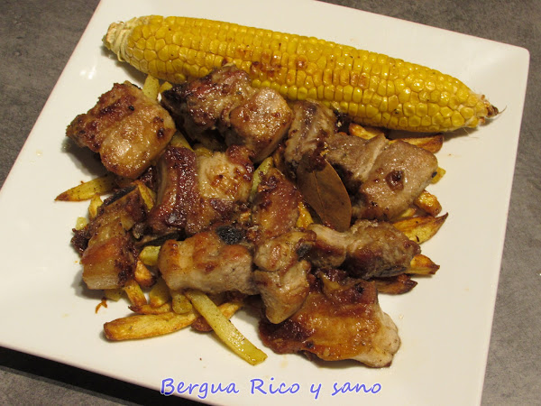 Lo que queráis. Es común acompañar las costillejas con patatas; yo las hice en la freidora de aire, porque con una cucharada de aceite les sobra. Además hice mazorcas de maíz asadas porque me gustan mucho. Les puse un poco de mantequilla, sal, pimentón dulce y pimienta por todos lados, las envolví en papel albal y les di unos 45 minutos a 250°C.