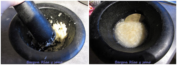 1. Machacamos los ajos pelados en el mortero. Dejamos macerar con el vinagre y el agua, comino y laurel mientras doramos la carne.