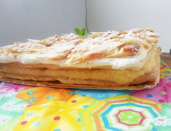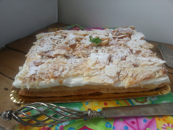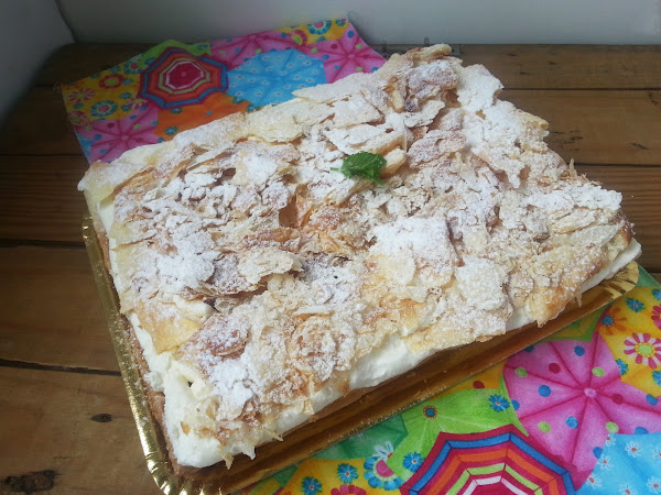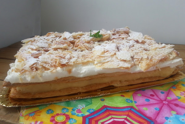 Para el montaje, poner una base de hojaldre, llenar una manga pastelera de crema pastelera y distribuirla por la base de hojaldre hasta que esta este totalmente cubierta (img 3). Poner encima la segunda masa de hojaldre horneada y con una manga pastelera llena de la nata montada (crema de leche) distribuirla también sobre la segunda capa de hojaldre hasta cubrirla totalmente (img 4-5).