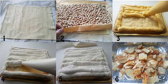 Mientras se enfría, extendemos las 3 masas de hojaldre, pincharlas con un tenedor (img 1), ponerles encima algún peso para que no se inflen. Yo como veis en la imagen 2, tengo un kilo de garbanzos que uso desde hace tiempo; pongo un papel de horno encima del hojaldre, riego por encima los garbanzos, que retiro y guardo después de hornear. Puesto el peso, llevar a horno pre calentado a 180○ C por 25 minutos. Retirar del horno y dejar enfriar. Reservar.