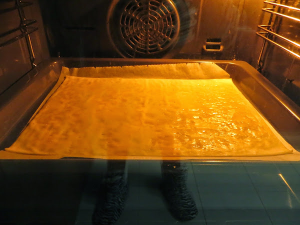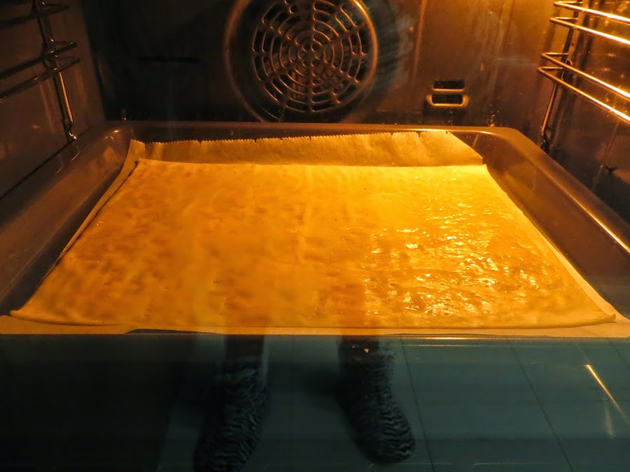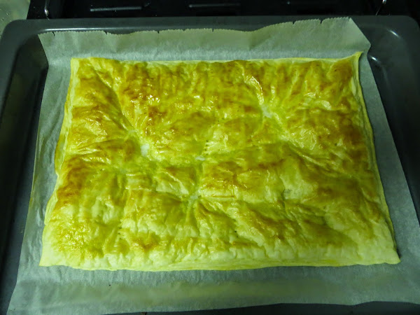 Ahora nos ponemos con el hojaldre, extendemos la primera plancha de hojaldre sobre una superficie lisa y la pintamos con huevo batido, la pinchamos con un tenedor para que no suba y la horneamos durante 15 minutos (hasta que esté dorada) a 190º. La sacamos del horno y hacemos el mismo proceso con la segunda plancha de hojaldre (en el caso de emplear tres, el mismo proceso con las tres).