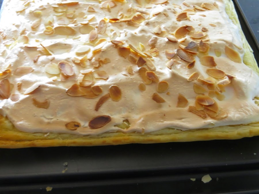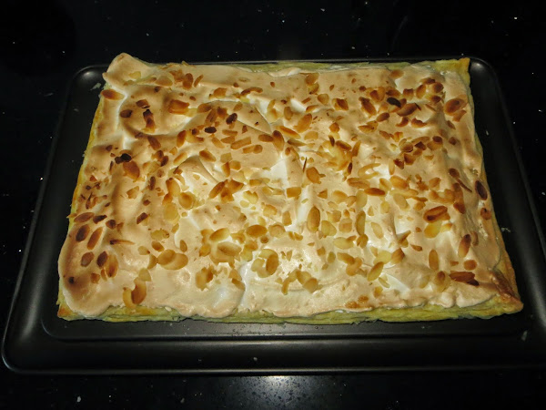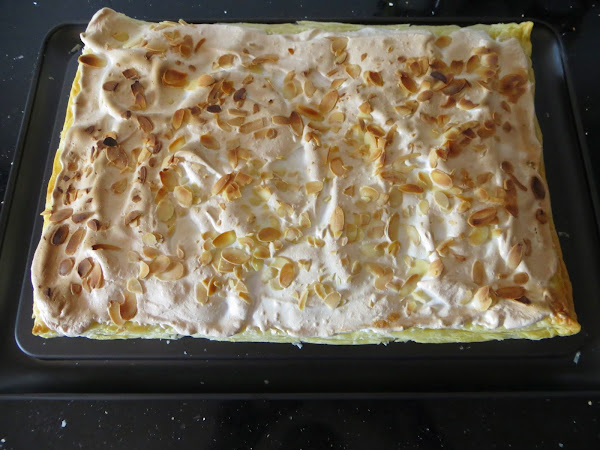 Ahora llega la hora de montar la costrada, cogemos una de las planchas y extendemos la crema pastelera, ponemos la otra capa de hojaldre encima y untamos el merengue, echamos la almendra laminada por encima y metemos al horno durante 5 minutos a 150º para que se tueste la almendra. Tened cuidado, ya que la almendra se quema enseguida, dejáis enfriar y ya está lista para comer.