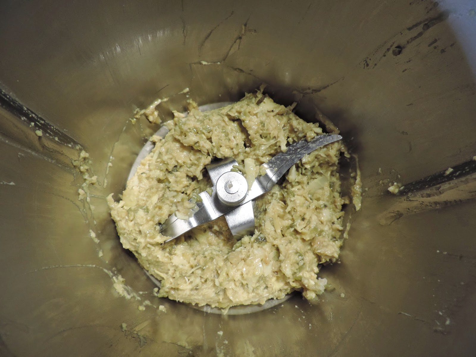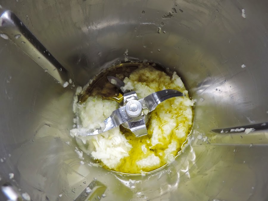 Picamos la cebolla, 20 segundos, velocidad 5, añadimos 2 cucharadas de aceite de oliva.