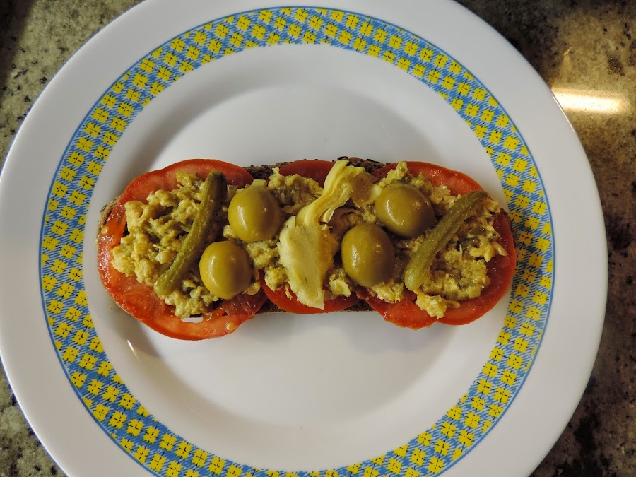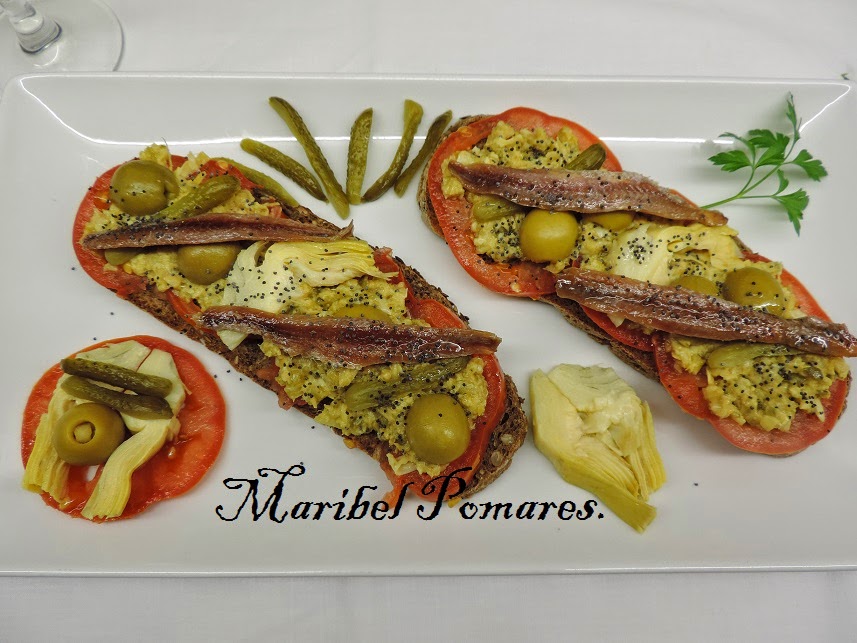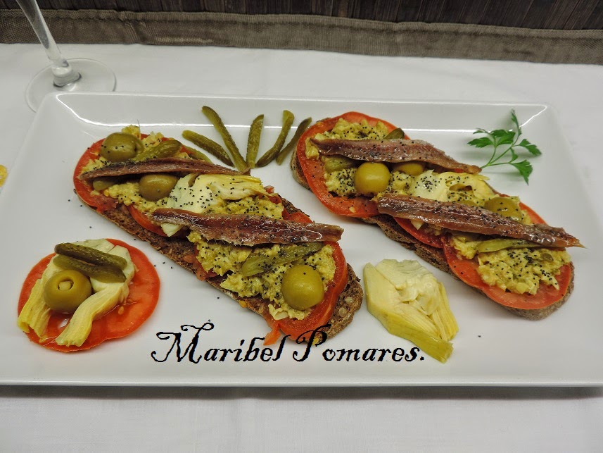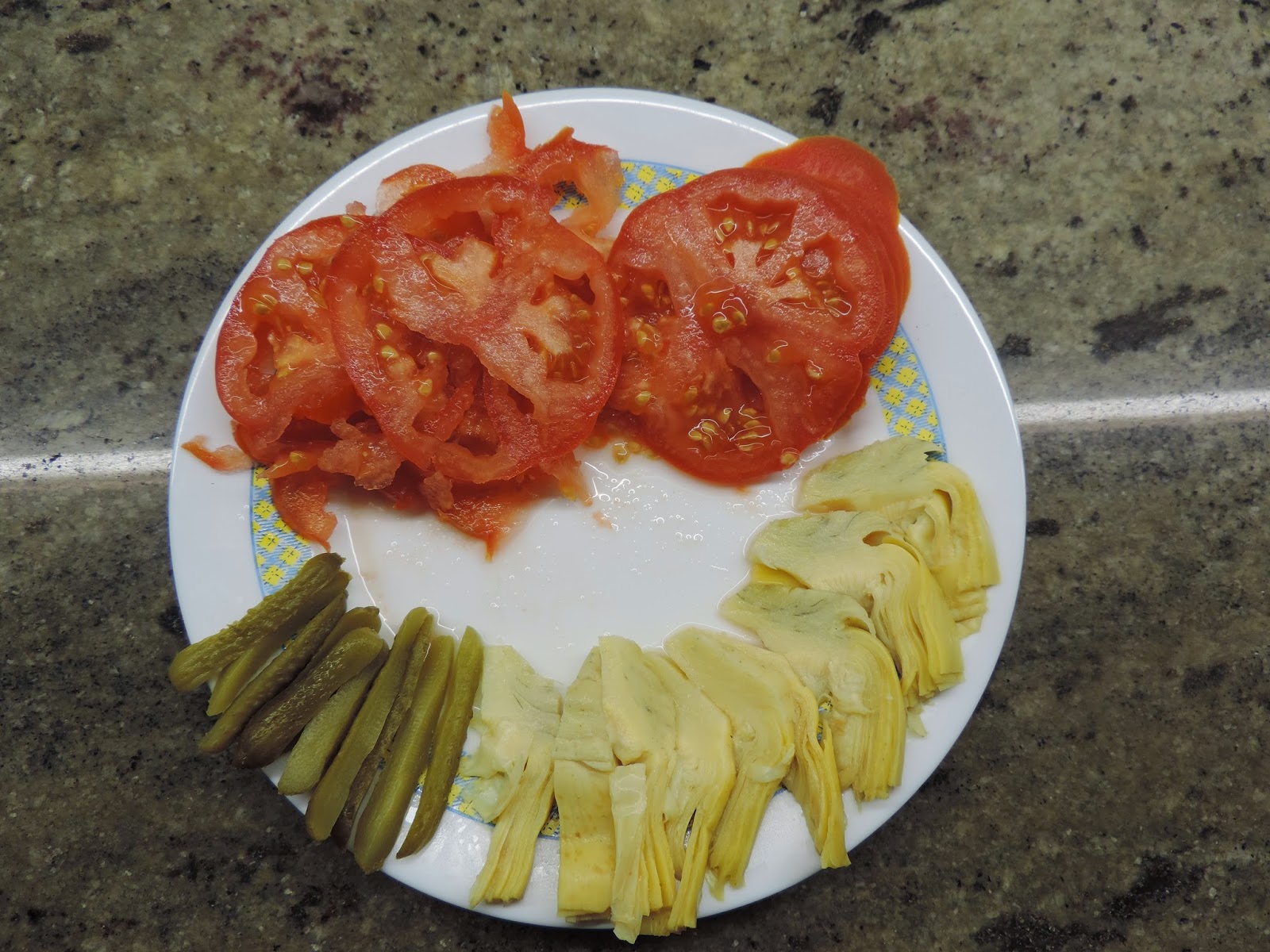 Cortamos el tomate en rodajas, unos pepinillos y alcachofas en tiras para decorar.