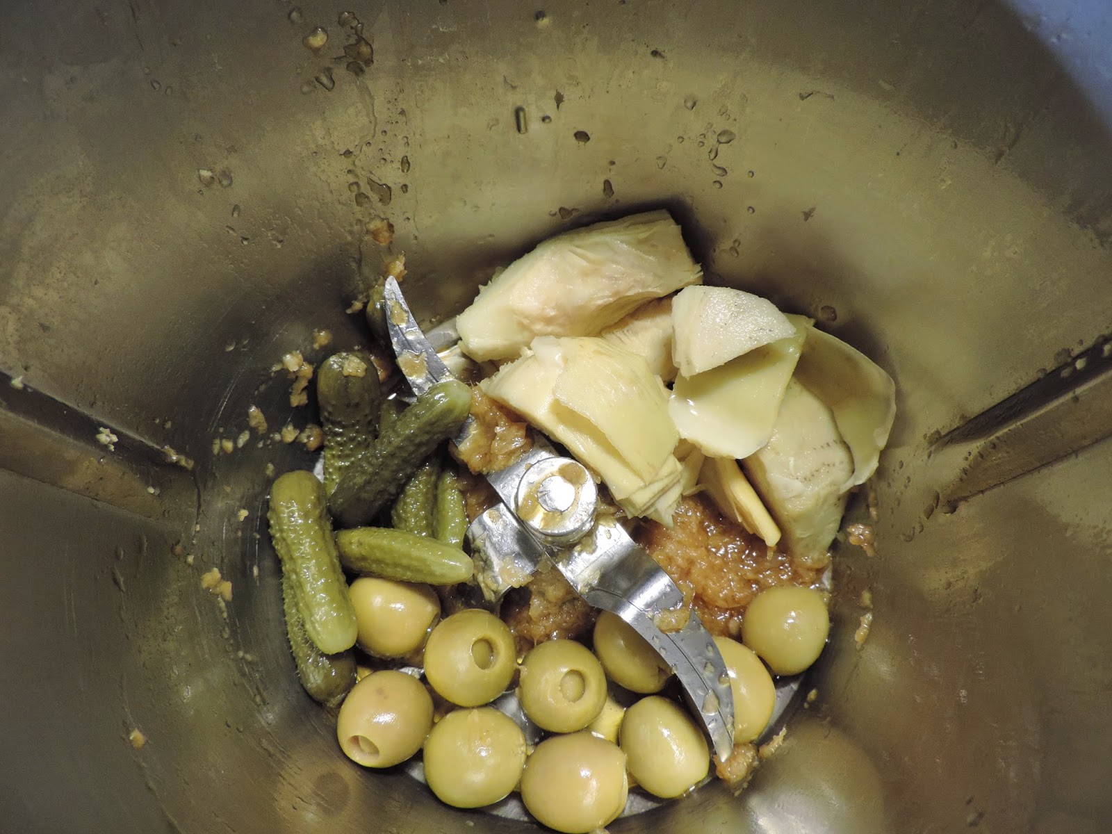 Poner en el vaso las 2 cucharadas de la ajada, las olivas, pepinillos en vinagre y las alcachofas.