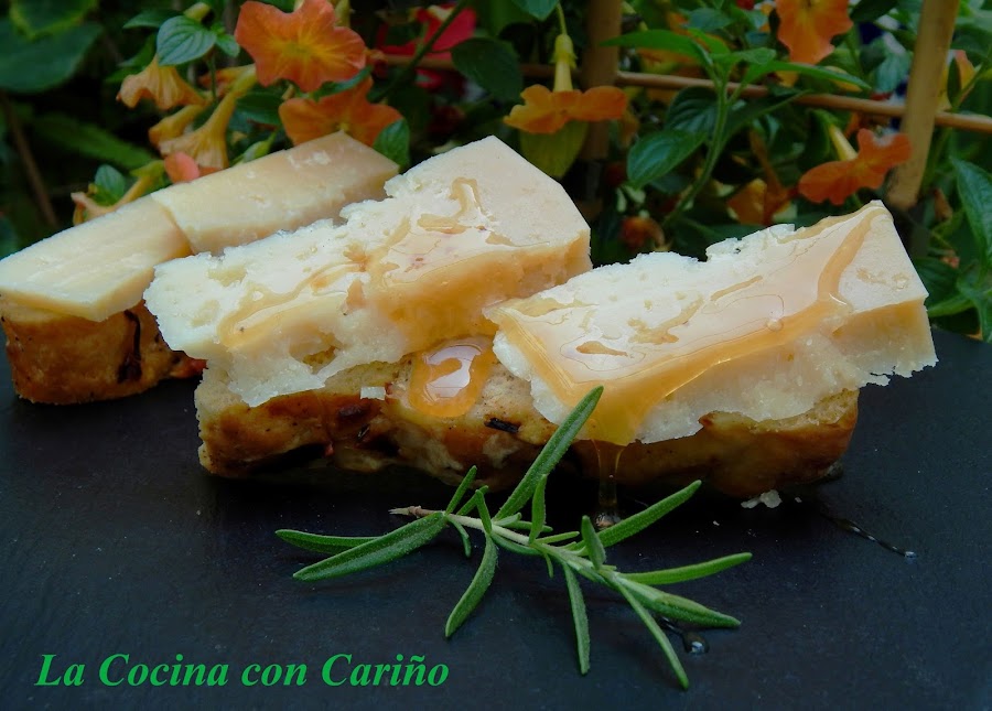 Es una manera perfecta de aprovechar los restos que se nos ponen algo duros de una focaccia. En realidad, casi siempre se asocian los costrinis a platos salados, pero me apeteció hacer un postre, con miel y un buen queso viejo.
