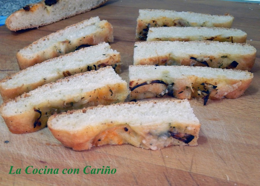 Cortamos la focaccia en rebanadas como de 1 ½ cm.