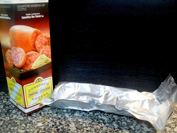 Trajerón un cotechino, (se pronuncia cotequino, para los que no lo saben), para que yo lo probara, ya que ellos lo habian comido y les gustó mucho. El cotechino es una especie de embutido o salchicha grande de carne magra de cerdo, muy melosa, en forma de pie de cerdo, que hace de funda y a la que debe el nombre, con sabor de ello y muy rico por cierto. Se suele vender en crudo, con lo cual hay que cocerlo sobre unas 3 a 4 horas, y precocido, que en media hora de cocción, está listo. Éste último es el que trajeron para que yo lo probara.