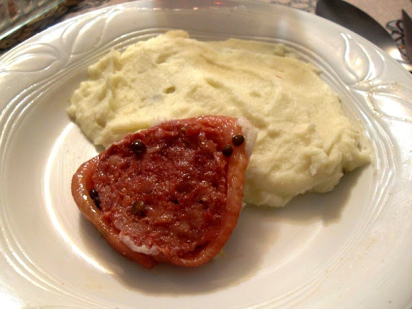 Servir el cotechino con las lentejas calientes y/o con el puré de patatas espeso, según gustos.