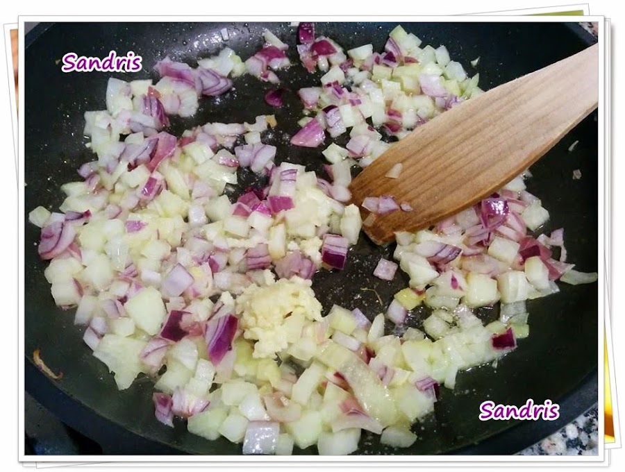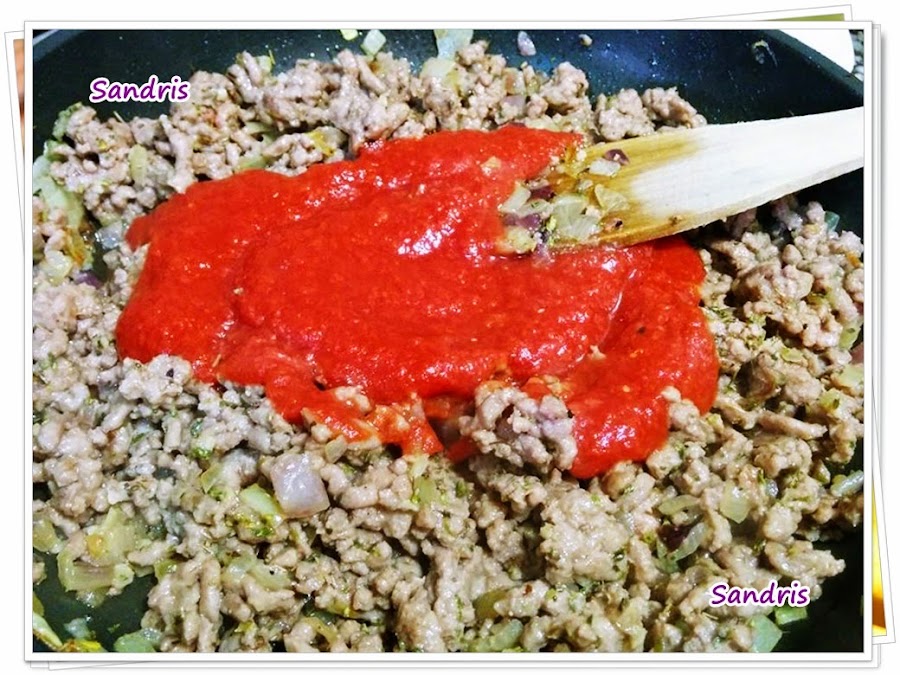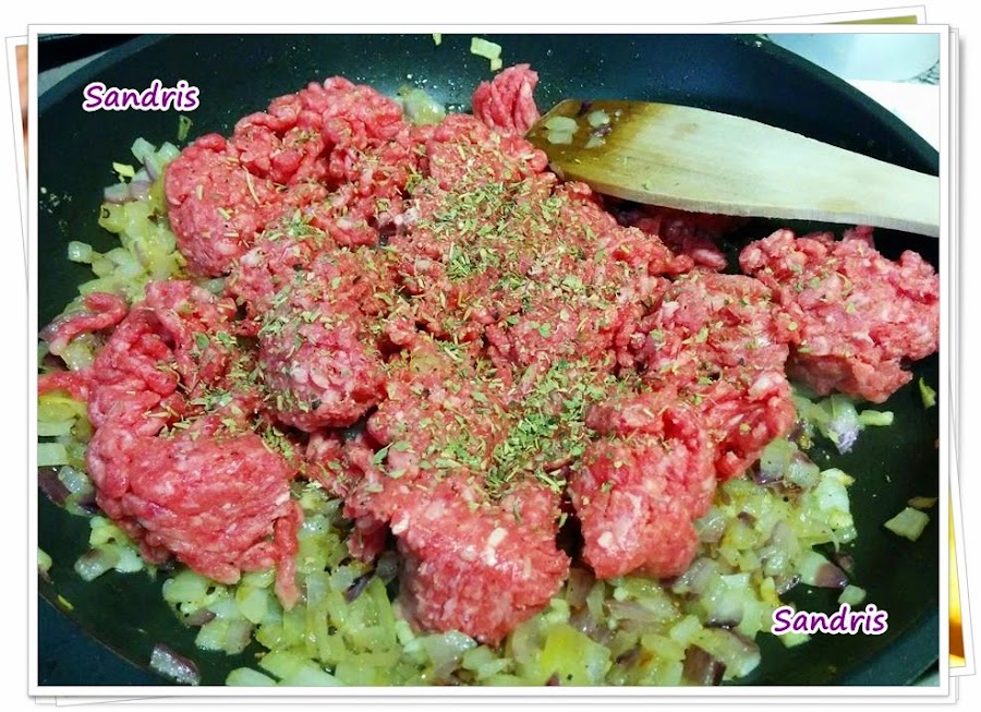 Primero sofreímos la cebolla y el ajo. Cuando esté casi hecho, ponemos la carne picada (yo la salpimento antes de ponerla en la sarten y así controlo más el toque que le quiero dar de especias), la rehogamos hasta que esté casi hecha y le ponemos el tomate triturado (a mi me gusta usar triturado o rallarlo yo en casa, pero si no os gusta o no tenéis y le queréis poner tomate ya frito del que venden ya listo para usar, no hay problema, solo que eso lo tenéis que poner ya lo último porque no necesita cocción), el orégano (o las especias que queráis) y lo dejamos unos 10-15 minutos a fuego lento. Aquí ya tenemos listo el relleno.