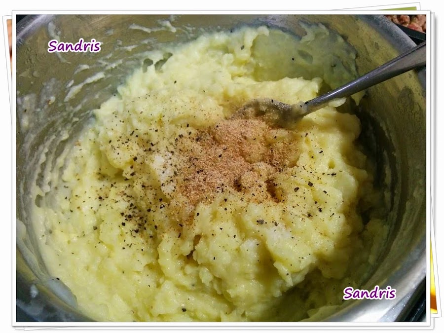 Para el puré, hervimos unas patatas, las pelamos y las machacamos con el tenedor o con lo que uséis en casa. Una vez aplastadas, las pasamos a un cazo, le ponemos un poco de margarina (o mantequilla) y la yema del huevo. Salpimentamos y le echamos leche poco a poco. A mí me apetecía ponerle un poco de nuez moscada, me gusta el sabor que le deja, así que... eso cada uno lo que le guste o le apetezca en el momento. Yo quería un puré de patatas no demasiado suave, sino con un buen toque de pimienta negra y nuez moscada y un pelin de pimienta blanca. Pero lo dicho, eso al gusto del consumidor.