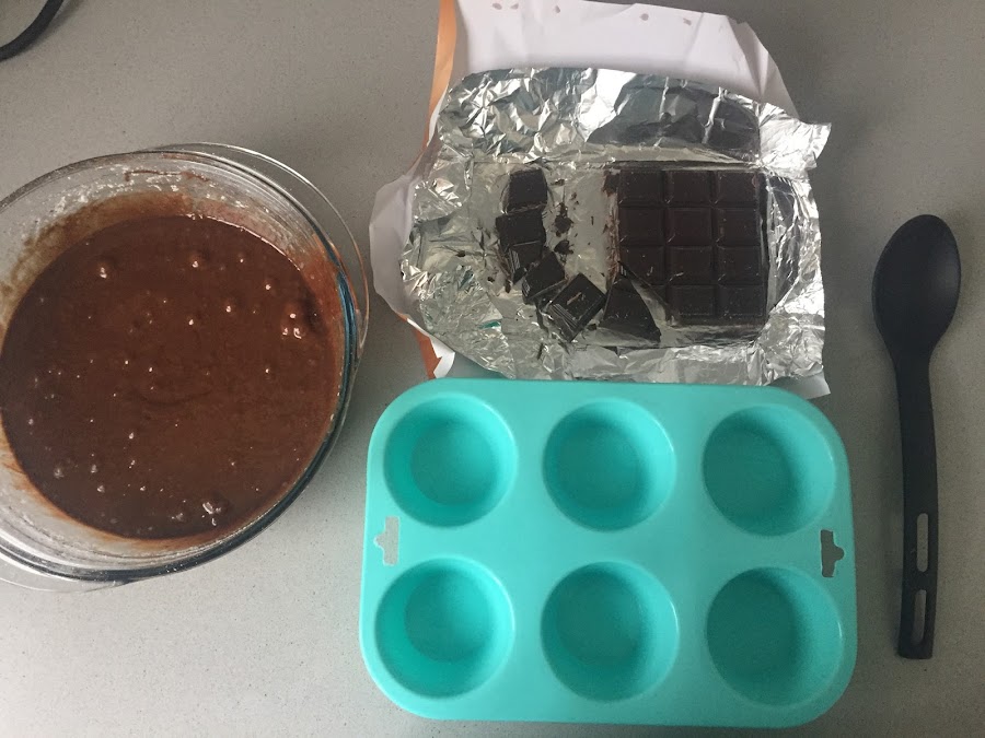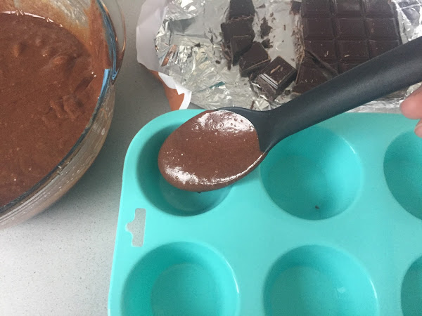 Precalentamos el horno a 200ºC y llenamos con nuestra mezcla 1/3 de los moldes para magdalenas que vayamos a usar, yo los he usado de silicona como se puede apreciar en las imágenes.