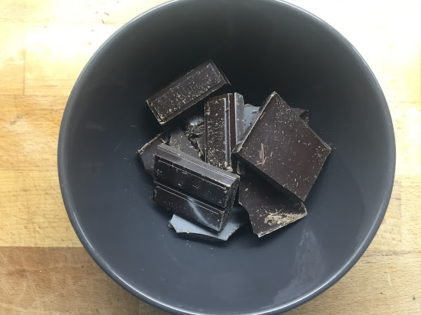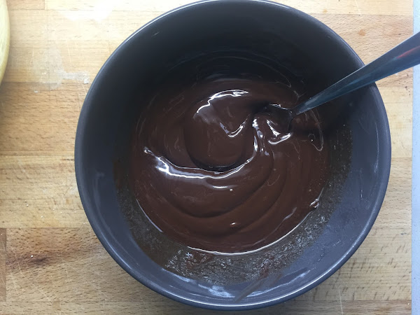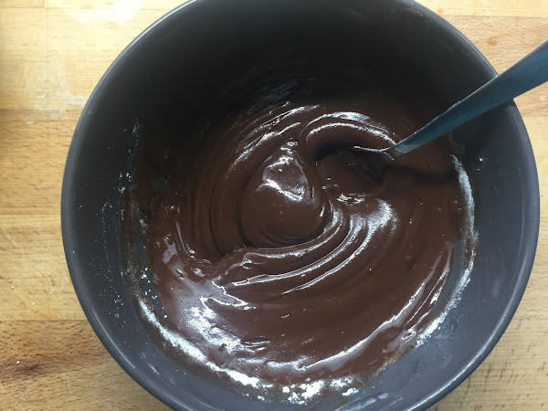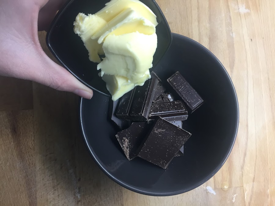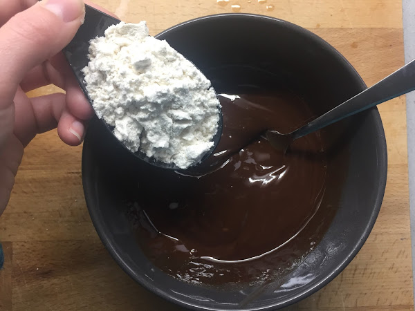 Ahora, ponemos en un bol apto para microondas el chocolate junto con la mantequilla y lo calentamos hasta que se derrita todo y se cree una masa homogénea. Añadimos la harina y volvemos a mezclar.