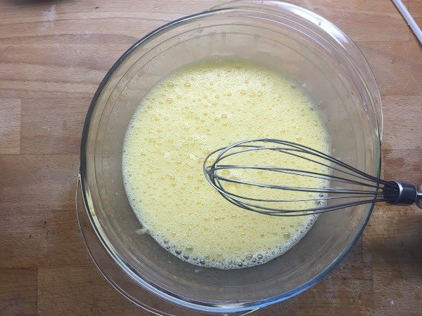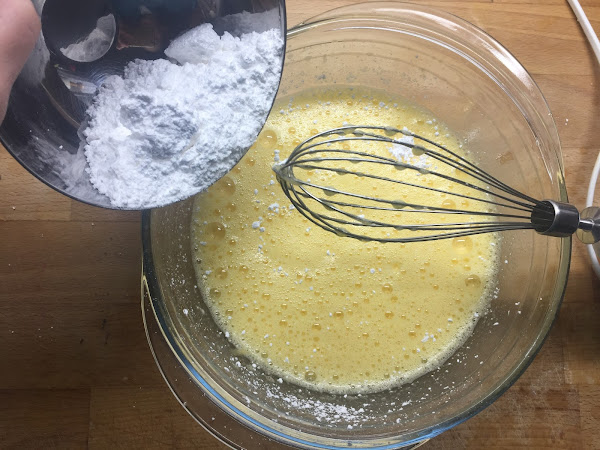 Primero ponemos los huevos en un bol y los batimos hasta que queden espumosos y doblen su tamaño. Cuando lo tengamos, vamos integrando el azúcar poco a poco y reservamos.