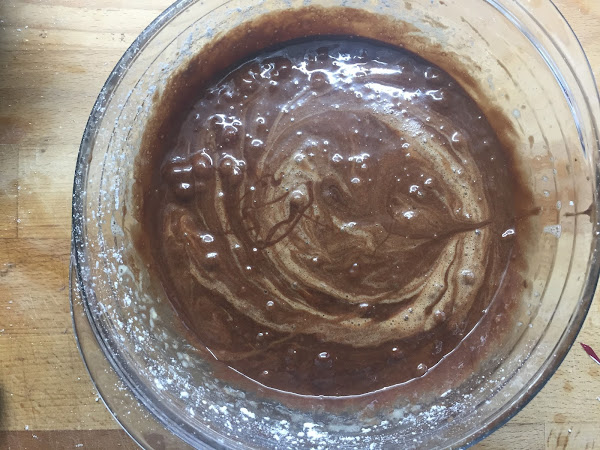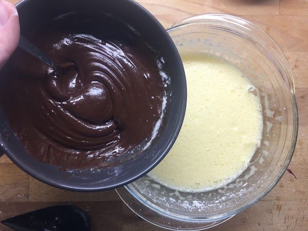 Después, añadimos la mezcla del chocolate al huevo y volvemos a mezclarlo todo.