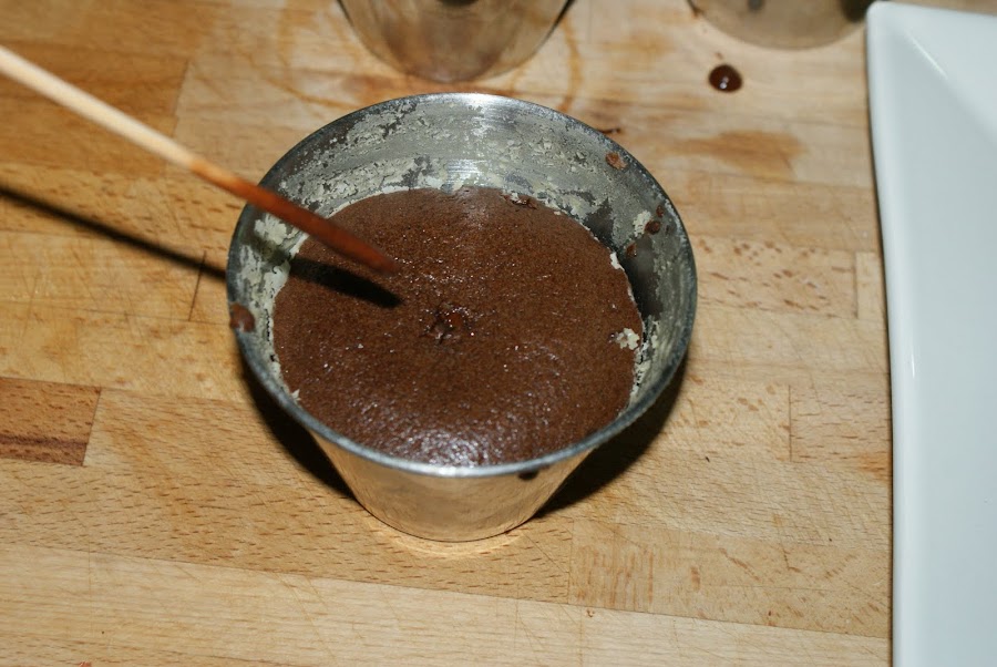 Hornear es el único punto “complicado”. Hay que hacerlos de manera que queden hechos por fuera pero líquidos por dentro. Para ello cuando los veamos hecho por fuera vamos pinchando con un palo y este debe salir manchado de chocolate mientras que los bordes se deben haber despegado del molde. Si tienes invitados siempre puedes hacer uno o dos de más por si acaso lo sacas antes.