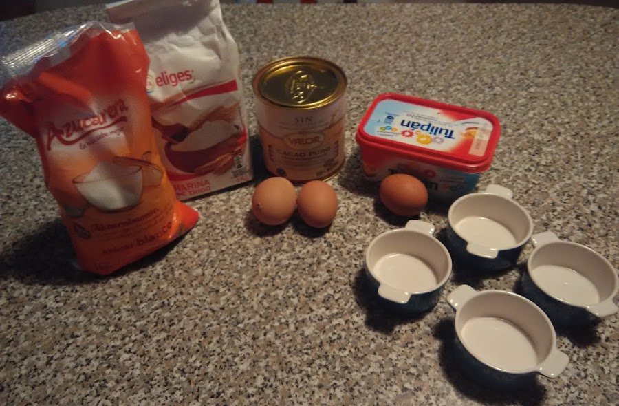 Bien, después de investigar en varias páginas web, de buscar trucos para encontrar la receta perfecta, y de hacer un mix, encontré lo que creía que era la receta más adecuada en tanto a sencilled y apariencia. Así que en cuanto tuve un hueco, me puse manos a la obra. La receta es para 6 cazuelitas aproximadamente, pero las raciones dependerán del tamaño de las que use cada uno en su casa. Como digo, la receta es muy sencilla, no tiene demasiados ingredientes ni complejidad de manipulación. Ahora sí, sí que hay una dificultad, encontrar el punto perfecto para que el centro del coulant quede derretido pero la masa por fuera esté bien hecha.
