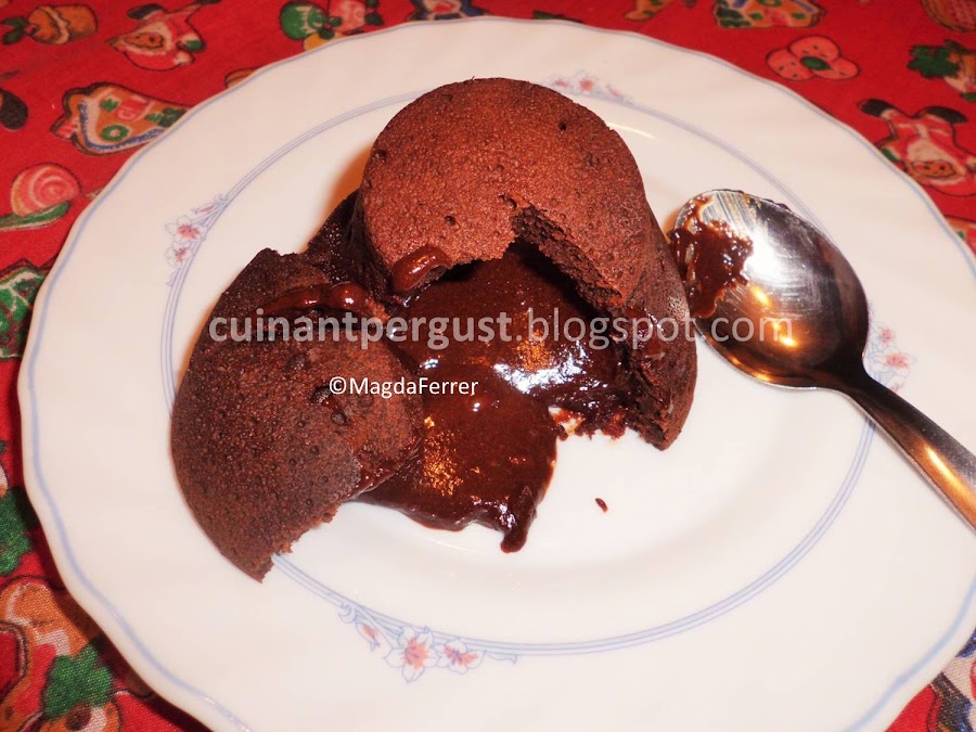 Unir la mezcla de huevos con el chocolate y remover hasta que todo quede bien incorporado. Llenar los moldes hasta ¾ de su capacidad e introducir en el horno. Bajar la temperatura a 180ºC con calor sólo abajo durante 12 -15 minutos, dependiendo del horno, o en cuanto el coulant empiece a despegarse un poco de la pared del molde. Esperar unos instantes para desmoldar los coulants sin quemarse. Servir de inmediato.