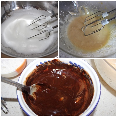 Mezclamos las yemas con el chocolate y a continuación añadimos la harina tamizada y mezclamos, por último añadimos las claras montadas con movimientos envolventes.