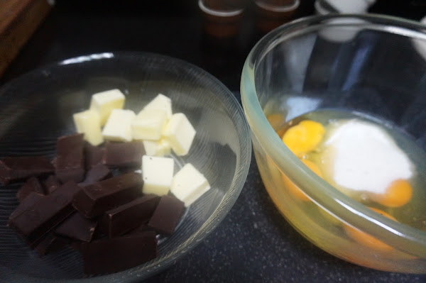 En un bol ponemos la mantequilla y el chocolate, en otro los huevos y el azúcar.